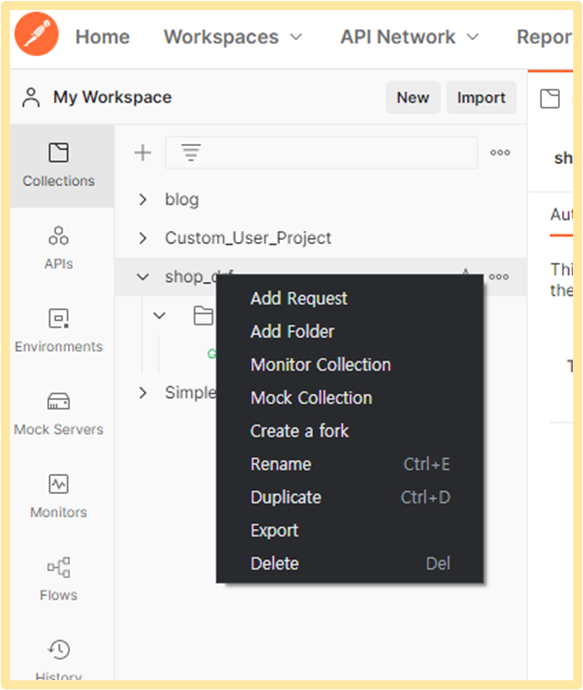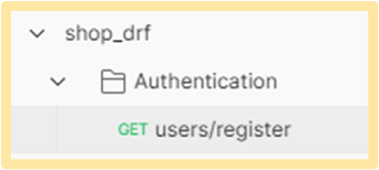 저는 보통 Collection 을 Project로 놓고 내부에서 폴더들로 App을 나누고 폴더 명을 App 이름으로 설정합니다. 예를 들어 Project 이름이 "shop_drf" 이고 App 이름이 "Authentication"이라면 그 모습은 아래와 같은 형태입니다.