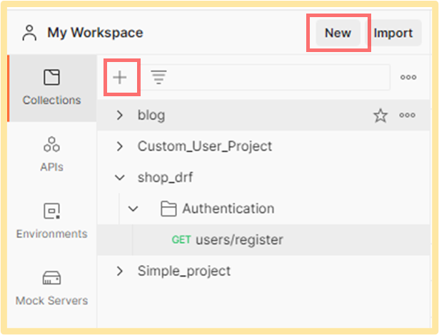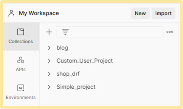 My Wrokspace를 누르면 <그림4>와 같은 형태가 나옵니다. 저희가 프로젝트 중에 사용할 부분은 Collections 부분입니다. 'blog', 'Custom_User_Project' 등은 제가 그동안 작성했던 프로젝트들 입니다.