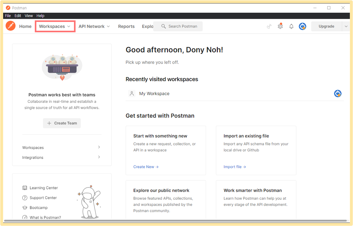 설치가 완료되면 Postman을 열어보겠습니다. <그림2> 에 나와 있는 Workspaces를 눌러 Workspace를 생성하거나 기존의 Workspace를 사용합니다. 저는 <그림3>에 있는 My Workspace를 사용하도록 하겠습니다.