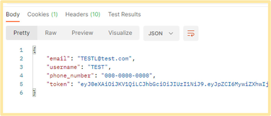 다음 옆에 "Send" 버튼을 눌러 요청을 보내줍니다. 그러면 하단에 다음과 같은 응답을 확인하실 수 있습니다. 여기서 token은 항상 다릅니다.