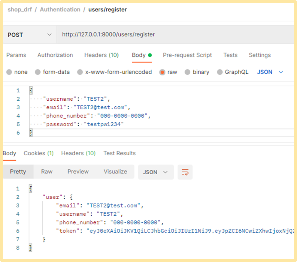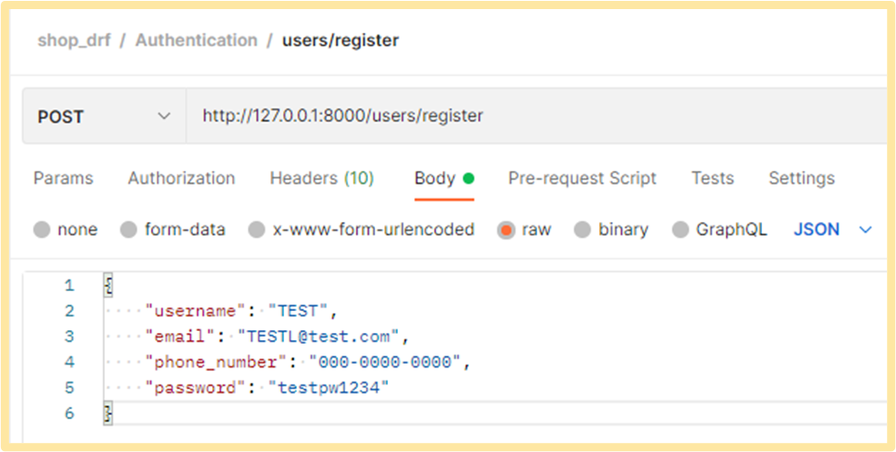 Postman을 열고, shop_drf 폴더를 만들어 Post Request를 추가해줍니다.