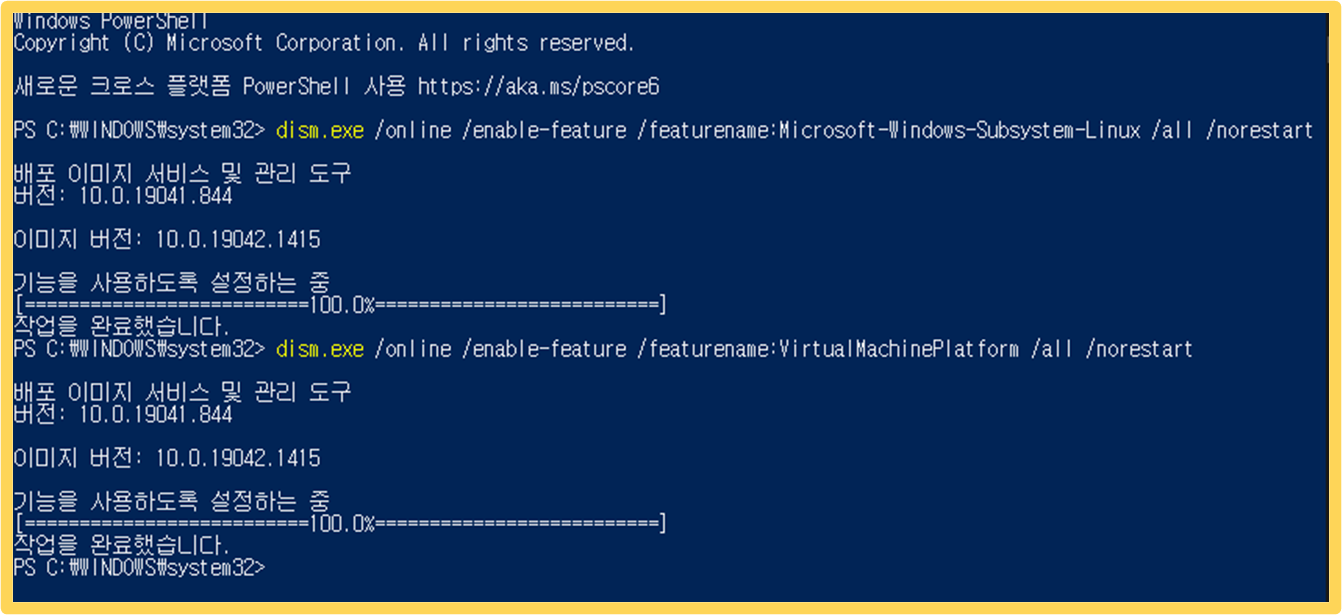 # VirtualMachinePlatform 기능을 활성화시키는 명령어 : WSL2 버전에 필요한 명령어