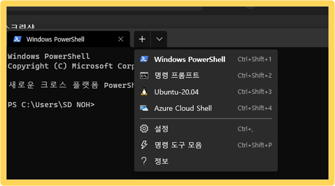 여기서 상단에 ∨ 버튼을 누르면 아래와 같이 PowerShell, CMD, Ubuntu 등을 사용할 수 있습니다.