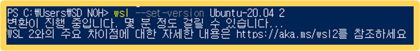 --set-version 명령어 뒤에 첫번째 인자로 wsl -l -v 했을 때 나타나는 목록 중 NAME 부분을 주고, 두번째 인자로 업데이트 할 버전을 입력합니다.