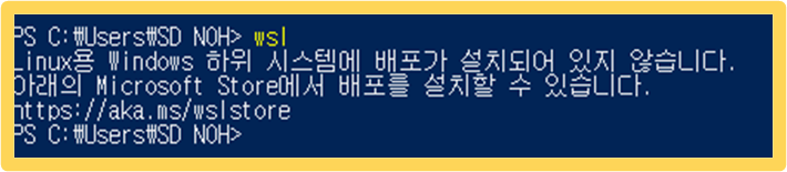 재부팅이 완료되면 Windows PowerShell 실행 후 아래와 같이 wsl 명령어를 실행해 설치가 되었는지 확인합니다. 아래 그림과 같이 나오면 성공적으로 설치된 것입니다.