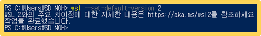 성공적으로 설치가 완료됐습니다. 이번에는 모든 WSL이 기본적으로 WSL2를 사용하도록 명령어를 입력하겠습니다.
