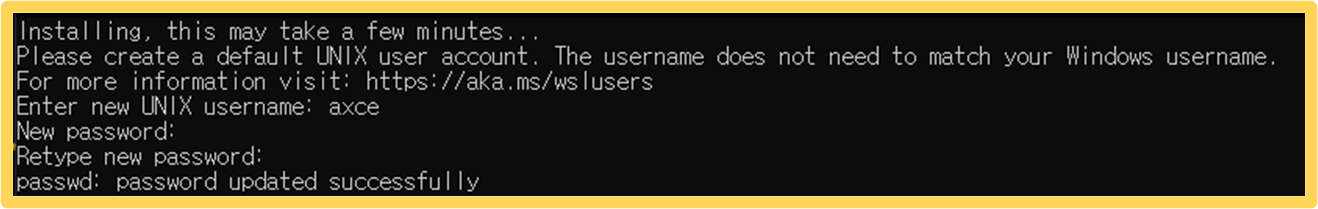 완료 후 실행, Ubuntu에서 사용할 username과 password를 설정해줍니다.
