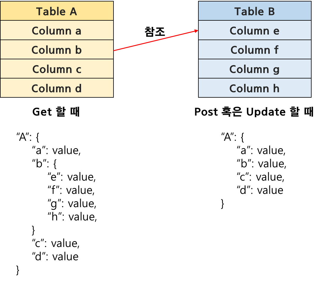 다음과 같이 하는 이유는 이미 정해져있는 B 테이블의 요소를 참조해 Get할 때 B 테이블의 요소들을 보여주고, Post나 Update할 때는 단순히 참조만 해서 이미 정해진 요소들을 사용하도록 하기 위함입니다. 저는 이 부분을 "등급, 그룹, 카테고리" 등을 지정할 때 사용했습니다.