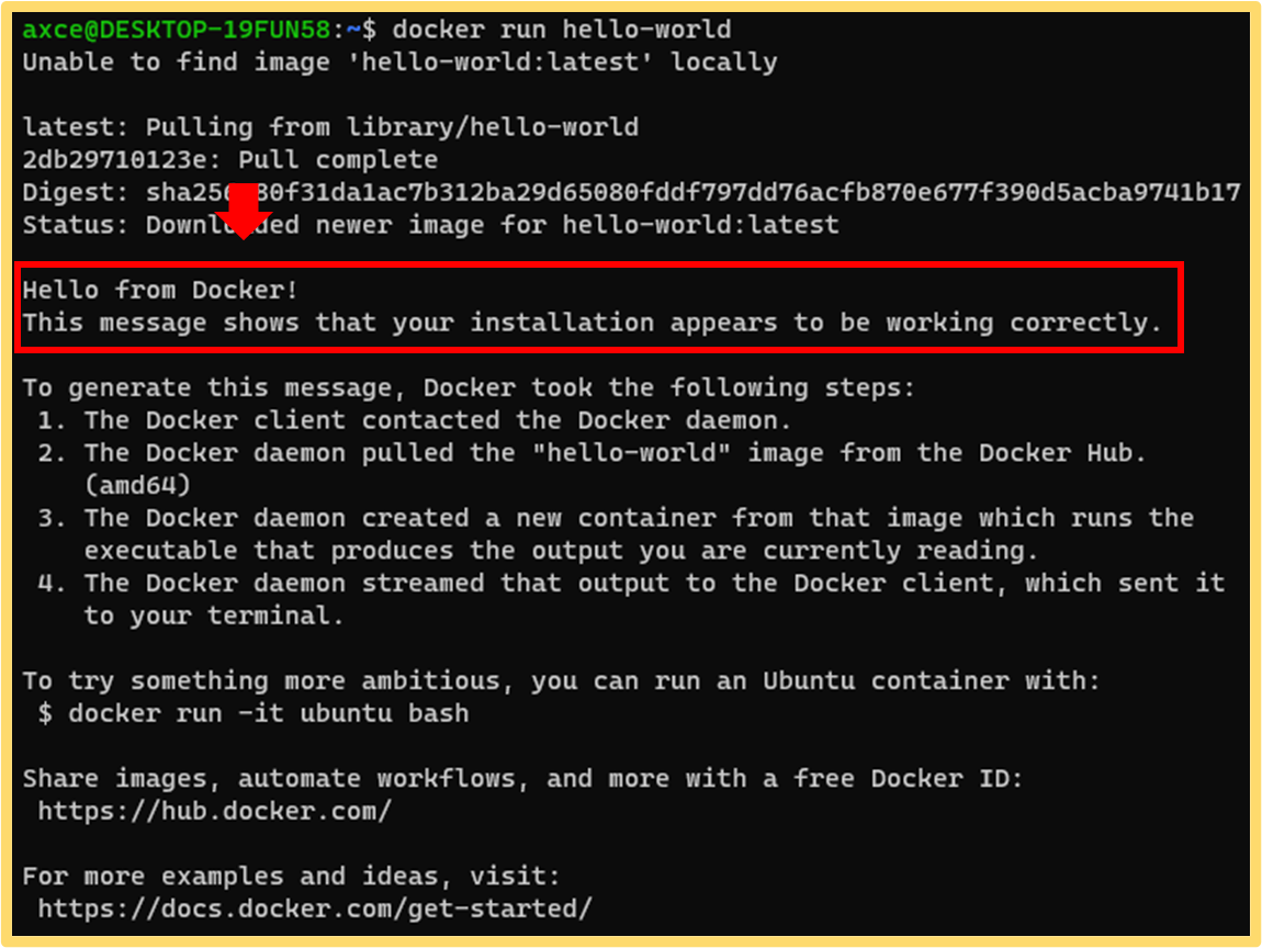 아래 명령어를 실행하고 빨간 박스 안의 문구가 나타나면 설치가 성공적으로 완료된 상태입니다. 명령어를 실행한 뒤 "Unable to find image 'hello-world:latest' locally" 문구가 나타나고 얼마 간의 시간이 지나야 아래 글들을 확인하실 수 있습니다. 급하게 종료시키지 말아주세요 ^^