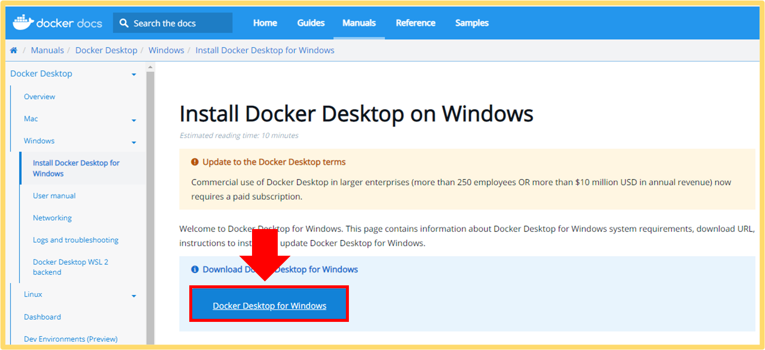 Window 환경에서 Docker를 사용하기 위해서는 Docker Hub에서 제공하는 Docker Desktop for Windows 를 다운 받아야 합니다.