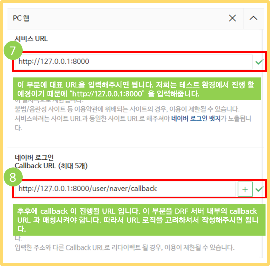 - Naver Developers 에서 설정했던 서비스 URL 입니다. 현재는 테스트 환경이기 때문에 IP 주소를 사용했습니다.