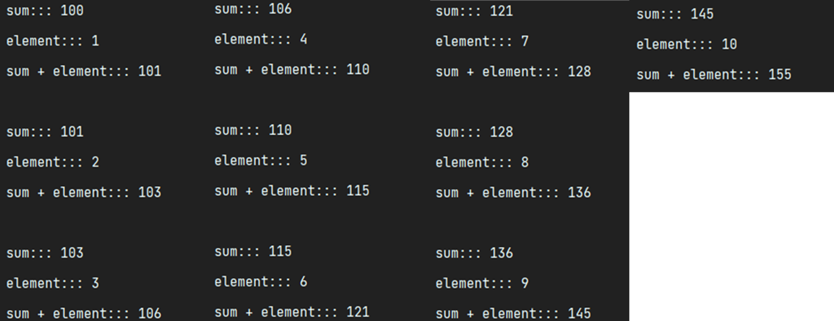 처음 sum 의 값은 초기값으로 들어갔던 100을 갖고, element 값은 배열 absolutes의 첫 번째 값을 갖습니다. 여기서 우리는 "sum + element" 를 했습니다. 그 결과 두 번째 계산 때 sum은 초기값과 absoultes의 첫 번째 값을 합친 101을 갖고 있습니다. 다시 그 sum에 absolutes 두 번째 값을 더해 103 결과를 내고 10번째까지 이어져 결과적으로 155라는 값을 반환하게 됩니다.