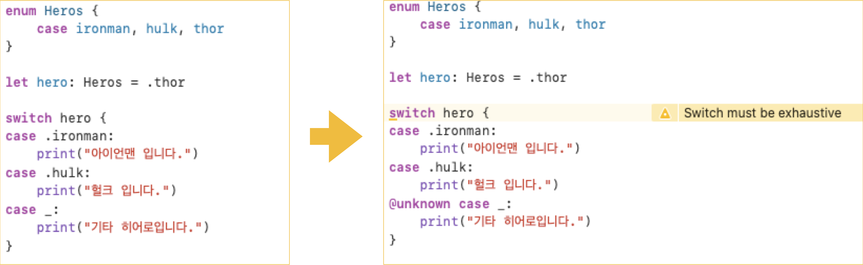 아래 case _: 앞에 @unknown을 붙여주면 case에서 빠진 부분을 표시할 수 있습니다.