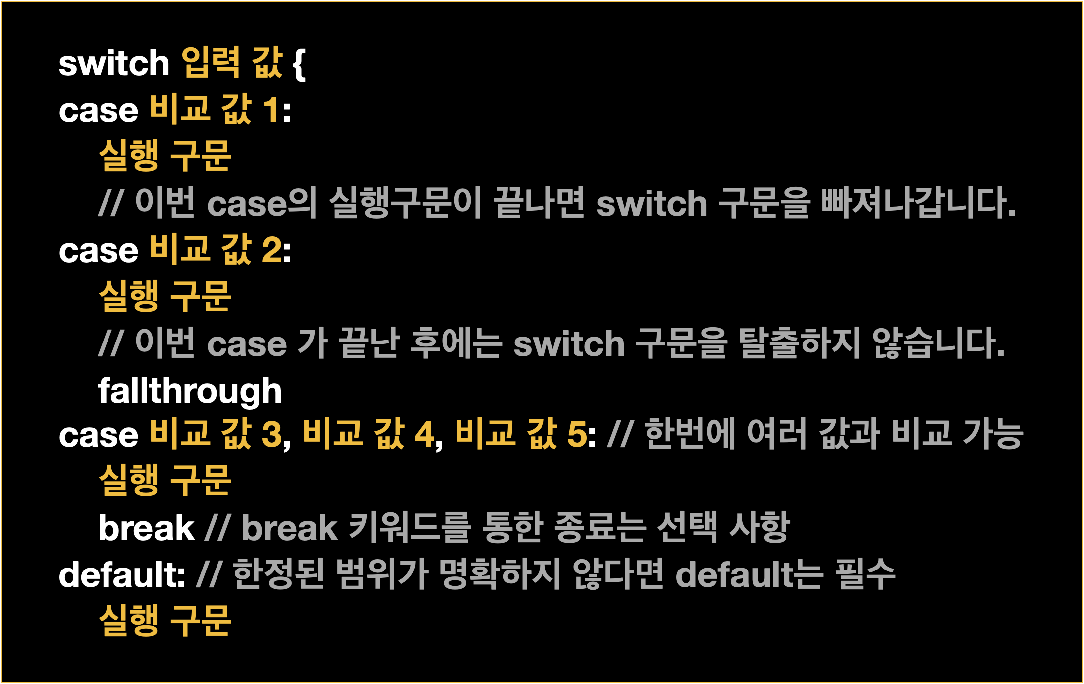 - case를 연속 실행하고자 하는 경우에는 fallthrough 키워드를 사용해야 합니다.