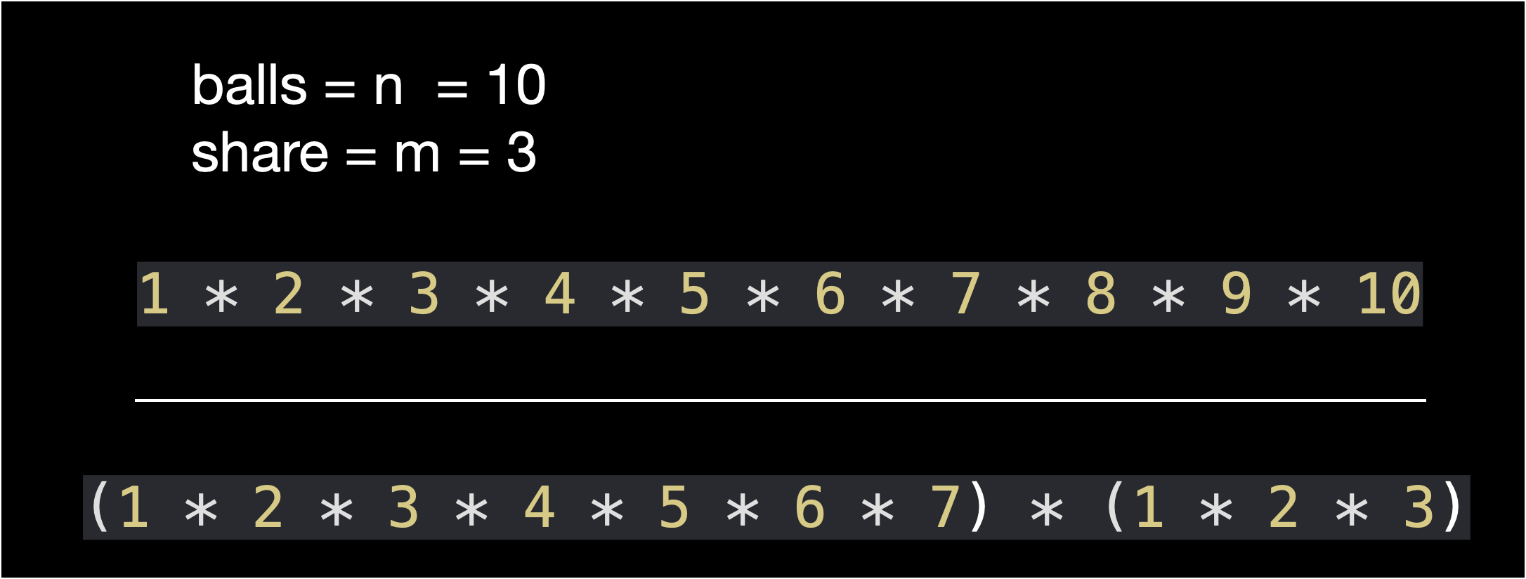 "그림1" 에서 분자의 1부터 7까지는 분모에 의해 나누어 떨어진다. 그럼 남는 부분은 분자 8, 9, 10 그리고 분모 1, 2, 3이다. 분모는 결국 share와 같다. 또 분모는 1에서 10까지의 곱 중 1에서 7을 뺀 나머지 8, 9, 10이다. 이를 코드로 만들어주면 위의 코드와 같다.