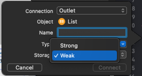 [Storage] 영역의 옵션은 "Strong"과 "Weak"이 있습니다. 기본 값은 "Weak" 옵션입니다. 해당 옵션은 iOS 시스템(ARC)에서 변수의 메모리 관리와 관련이 있습니다. "Strong" 타입은 강한 참조, "Weak" 타입은 약한 참조라고 부릅니다.
