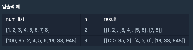 Q. 정수 배열 num_list와 정수 n이 매개변수로 주어집니다. num_list를 다음 설명과 같이 2차원 배열로 바꿔 return하도록 solution 함수를 완성해주세요.