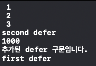 첫 번째, 두 번째, 세 번째 프린트가 차례대로 출력되고 defer 구문이 역으로 출력되는 모습입니다. defer 구문에서는 순서대로 출력됩니다.
