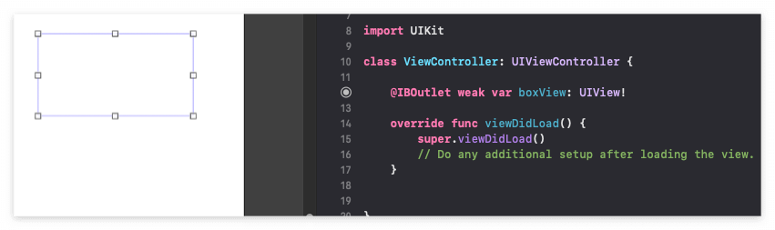 이 뷰를 ViewController.swift 파일에 @IBOutlet 으로 연결해줍니다.