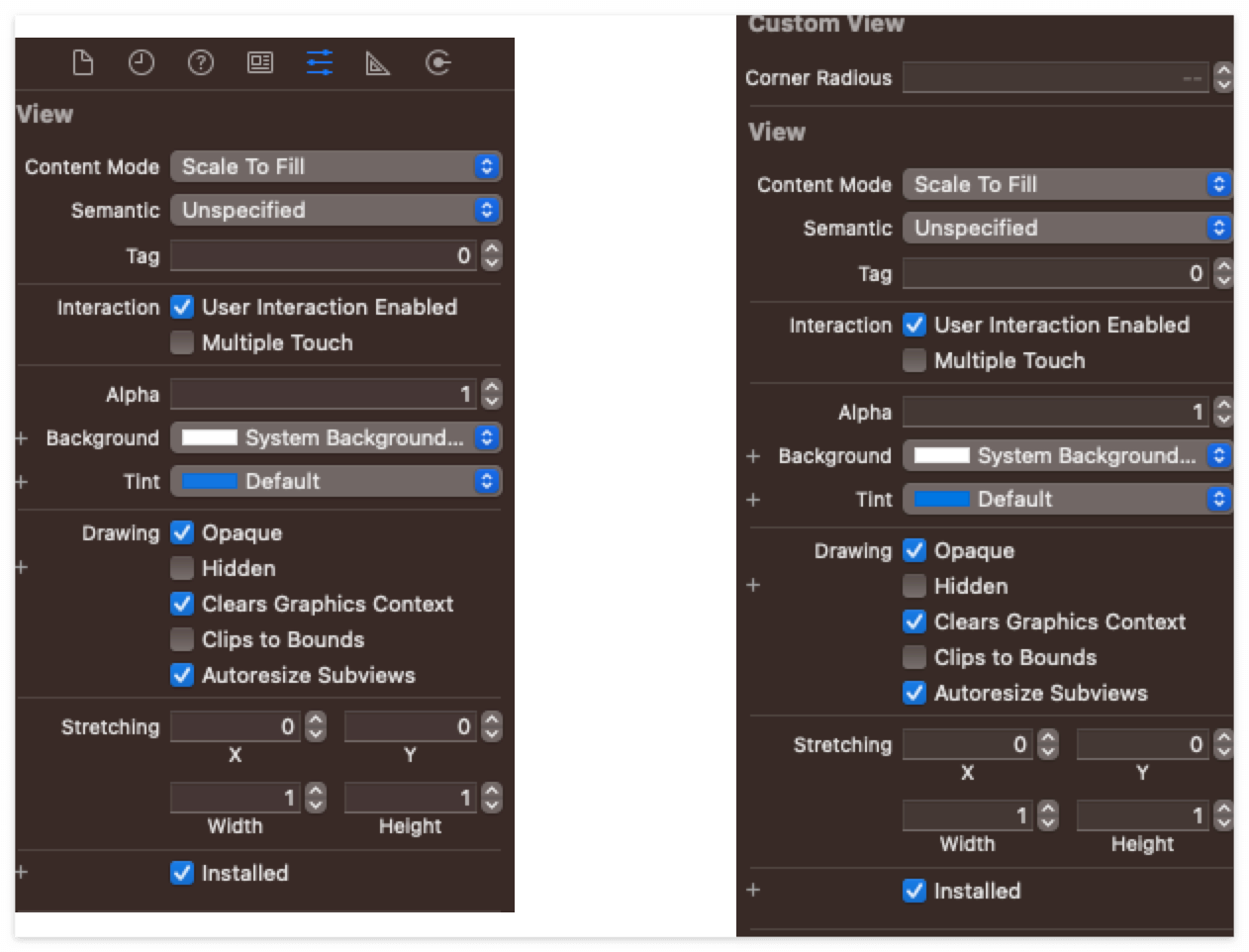 차이가 보이시나요? 맨위에 Custom View 부분이 생긴 것을 확인할 수 있습니다. 그 부분에는 Corner Radious 옵션을 입력할 수 있도록 되어 있습니다. 이처럼 @IBInspectable은 Inspector 에서 쉽게 Corner Radious 등의 옵션을 수정할 수 있도록 합니다.