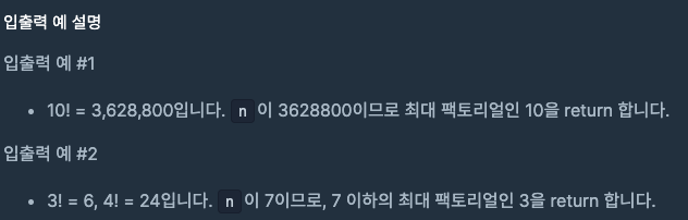 Q. i팩토리얼 (i!)은 1부터 i까지 정수의 곱을 의미합니다. 예를들어 5! = 5 * 4 * 3 * 2 * 1 = 120 입니다. 정수 n이 주어질 때 다음 조건을 만족하는 가장 큰 정수 i를 return 하도록 solution 함수를 완성해주세요.