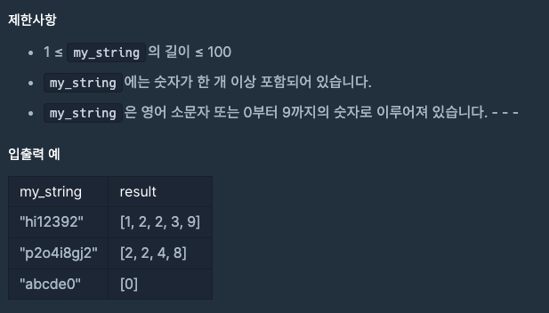 Q. 문자열 my_string이 매개변수로 주어질 때, my_string 안에 있는 숫자만 골라 오름차순 정렬한 리스트를 return 하도록 solution 함수를 작성해보세요.