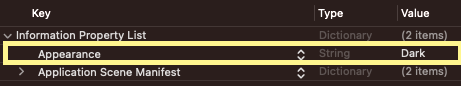 iOS에는 Light 모드와 Dark 모드가 있습니다. 밝은 곳에서는 Light 모드를 지원해주고, 어두운 곳에서는 Dark 모드로 변경해주도록 설정되어 있습니다. 하지만 제가 기획한 것은 애초에 Dark 모드만을 가정했기 때문에, Dark 모드만 사용할 수 있도록 설정해주어야 합니다. 그래서 저는 info.plist 에 Appearance를 설정해서 "다크모드"로만 나타나도록 설정해주었습니다.