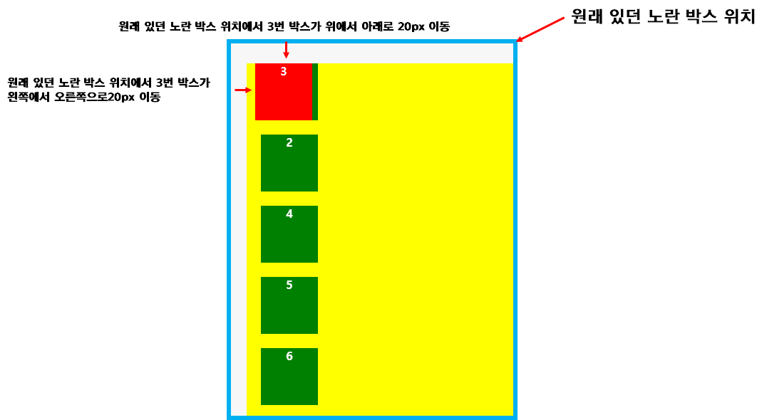 relative 속성값은 원래 있어야 하는 위치에서 top, left, right, bottom 속성으로 위치를 이동시킬 수 있습니다.
