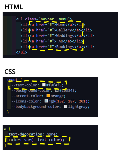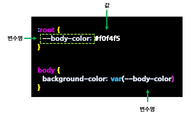 적용하고 싶은 부분에 "var()" 함수를 놓고 안에 변수명을 입력해줍니다.