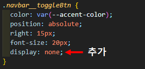 700px 이하일 때는 toggleBtn이 보이도록 설정하겠습니다. 아래의 코드를 @media 내부에 넣으시면 됩니다. @media 밖에서는 display: none; 으로 설정했던 부분을 display: block; 으로 바꿔줍니다.