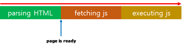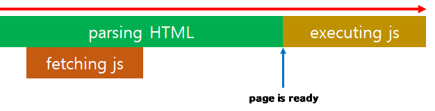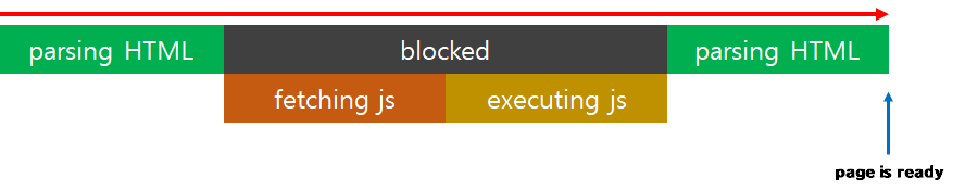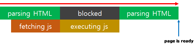이런 경우 브라우저는 우선 html을 위에서부터 parsing하고 중간에 script가 있는 부분에서 멈춰 javascript를 다운받고 실행합니다. 그 이후 미처 parsing하지 못한 html을 마저 parsing합니다.