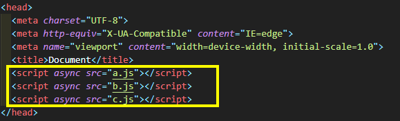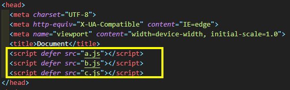 위의 예시는 async를 사용해 3개의 스크립트를 다운받는 상황입니다. javascript의 다운 받는 속도에 따라 blocked이 여러개 생기는 것을 볼 수 있습니다. 이 때문에 사용자들이 page를 확인하는 시간이 늦어지게 됩니다. 이 뿐만 아니라 a, b, c 파일이 순서를 갖고 있어 순차적으로 실행되어야 하는 경우 b파일이 먼저 다운되고 실행되면서 실행 순서가 b > a > c 의 순서로 바뀌면서 문제가 생길 수 있습니다.