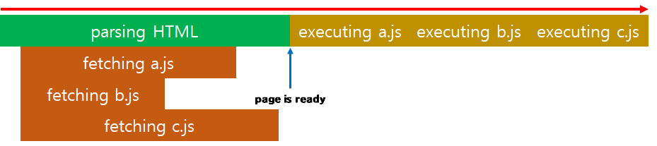 이 경우 a, b, c 파일을 모두 다운로드 받고 HTML이 모두 parsing 된 다음부터 순차적으로 javascript를 실행합니다. 이 때문에 사용자들은 빠르게 page를 확인할 수 있고, 순차적으로 javascript가 실행되기 때문에 순서가 바뀔 걱정을 하지 않아도 됩니다.