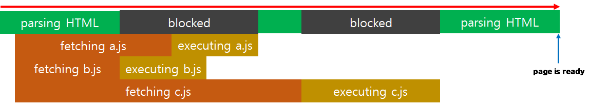 이 경우 a, b, c 파일을 모두 다운로드 받고 HTML이 모두 parsing 된 다음부터 순차적으로 javascript를 실행합니다. 이 때문에 사용자들은 빠르게 page를 확인할 수 있고, 순차적으로 javascript가 실행되기 때문에 순서가 바뀔 걱정을 하지 않아도 됩니다.