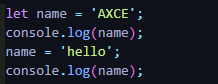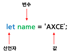 아래와 같이 선언자를 let으로 두고, 변수 부분에 변수 이름을 지정합니다. 그 후 "= 값"으로 값을 할당한 뒤 " ; " 를 붙여 선언합니다.