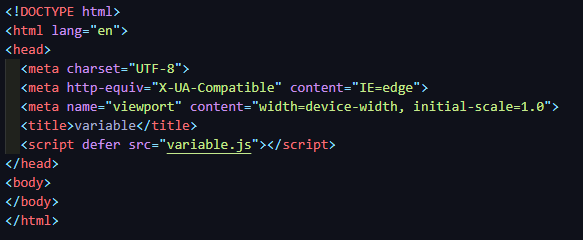 VScode 설치와 Extension 설치가 끝나신 분들은 VScode에서 폴더를 열어 index.html 과 variable.js 파일을 만드시기 바랍니다. 먼저 index.html에서 [ ! ] 를 치시고 [ Tab ] 키를 눌러 html 기본 코드를 생성합니다. 이후 <head> 부분에 variable.js를 삽입합니다.