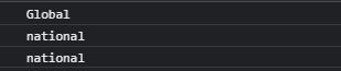 보시는 바와 같이 'national'이라는 값으로 값이 변경되어 출력된 것을 확인할 수 있습니다. 이를 통해 알 수 있는 부분은 global scope로 선언된 변수의 값은 블록 내부에서 변경하더라도 블록 외부에도 영향을 미치는 것을 알 수 있습니다.