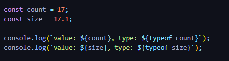 다른 언어에서는 실수형, 정수형 등으로 구분이 되지만 자바스크립트에서는 number 타입으로 고정이 되어 있습니다.