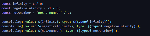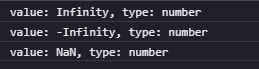 이 중 특별하게 표현되는 숫자 타입이 있는데, 그것은 infinity와 -infinity, NaN 입니다.