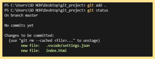 2)번 과정에서 Untracked files에 위치했던 파일들이 Changes to be committed에 위치한 것을 확인하실 수 있습니다. 또한 new file 이란 모습으로 초록색으로 변경되어 있음을 확인하실 수 있습니다.