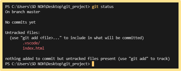 status 명령어는 현재 위치한 폴더 내의 파일 혹은 폴더들이 branch(브랜치)에서의 상태를 나타냅니다.