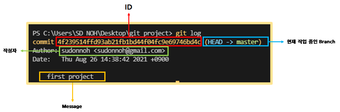 log 명령어로 commit의 ID, 생성자, 메세지 등을 확인할 수 있습니다.