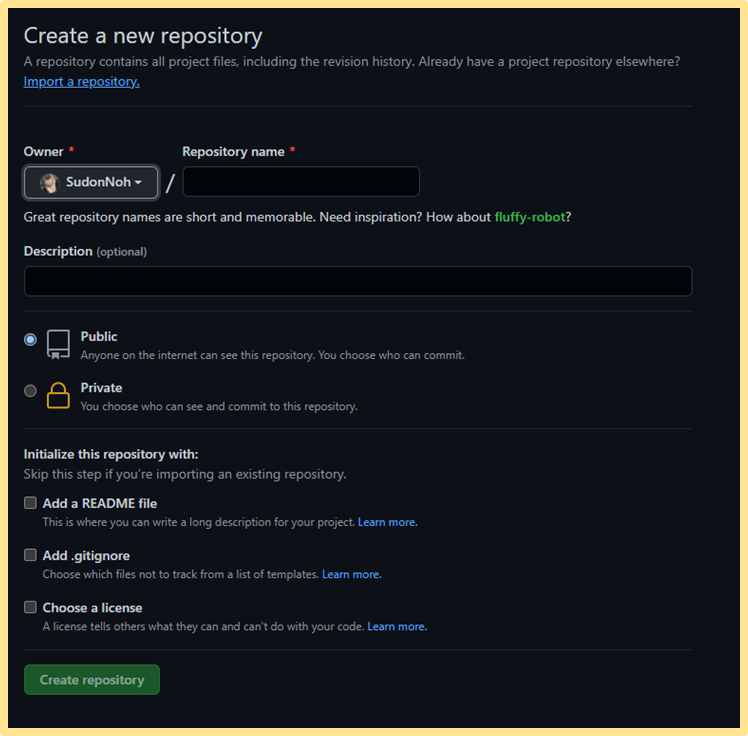 버튼을 누르면 나오는 화면입니다. 첫번째 Repository name은 Repository 접근을 위한 url로 사용되고 말 그대로 Repository의 이름이기도 합니다.