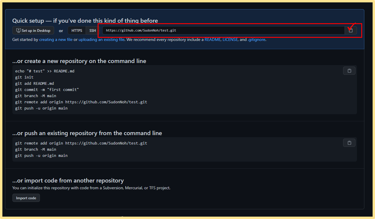 저는 Repository 이름을 test라고 지었기 때문에 주소 부분에