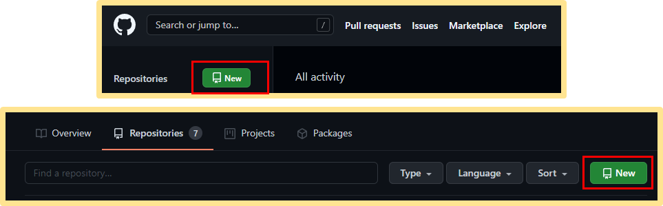 github에 로그인하시면 다음과 같이 Repository를 만들 수 있는 버튼이 있습니다. Repository는 프로젝트 폴더라고 생각하시면 됩니다. 로컬저장소(내 컴퓨터)에서 작업한 프로젝트들을 Repository라는 폴더에 주제를 나눠 저장한다고 생각하면 됩니다.