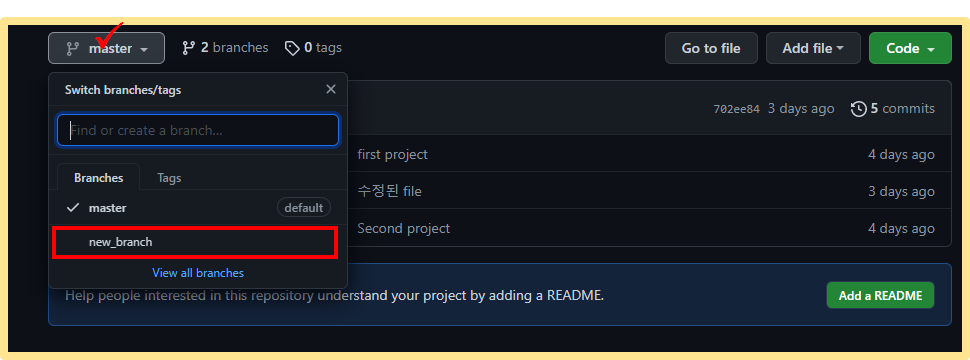 master 부분을 클릭하면 업로드 된 브랜치 별로 파일 등을 보실 수 있습니다.