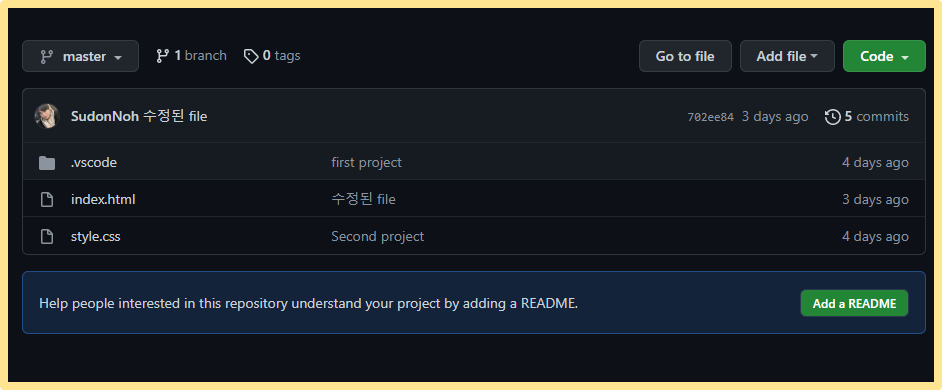 다음 메세지를 확인했으면 성공적으로 업로드 된 것입니다. 이번에는 원격저장소에 어떻게 업로드 되어 있는지 확인해보도록 하겠습니다.