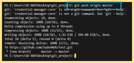 위의 코드를 통해 한 개의 branch를 업로드할 수 있습니다. master라는 branch를 원격저장소에 업로드해보도록 하겠습니다.